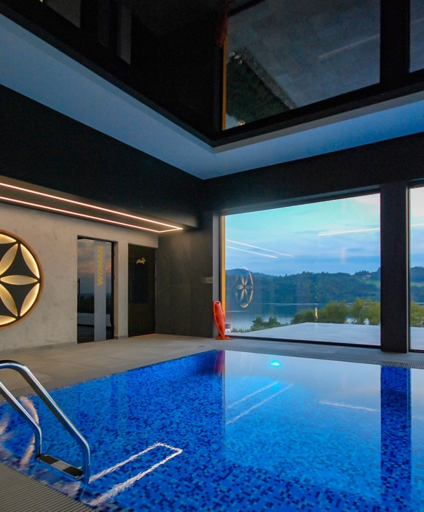 Wonderful pool measuring 4 m x 9 m with a depth of 118 cm, offering a panoramic view of Czorsztyńskie Lake and mountain peaks, as well as a relaxation zone. The pool water is heated to 29°C all year round. The pool also features a counter-current option for more demanding swimmers.
